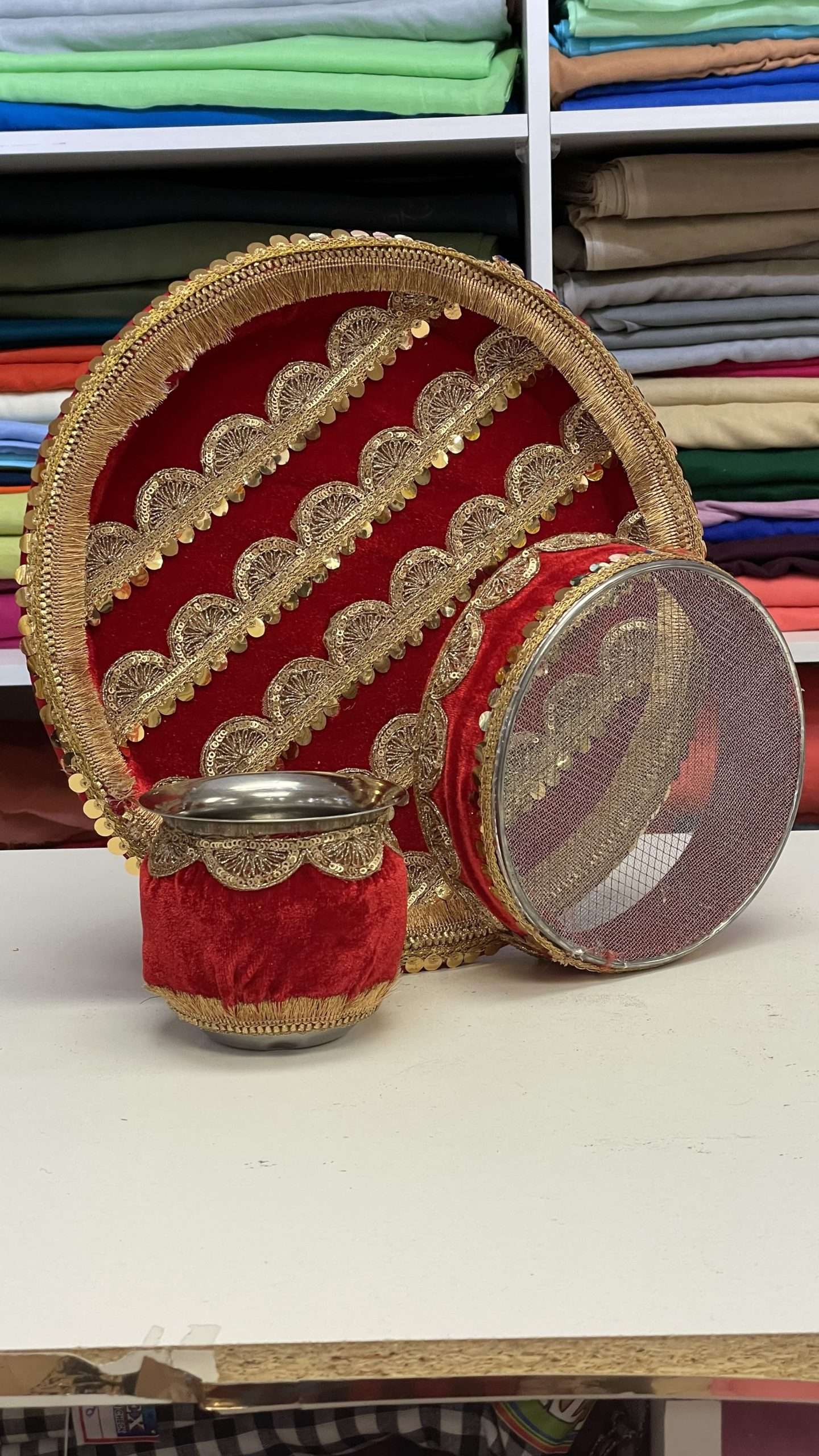 Collection of items and decorations that married women use during the Karva Chauth festival. The thali (plate) plays a central role in the festival, as it is used to hold various ritual items and offerings used during the puja (prayer ceremony) and the moon-sighting ritual.