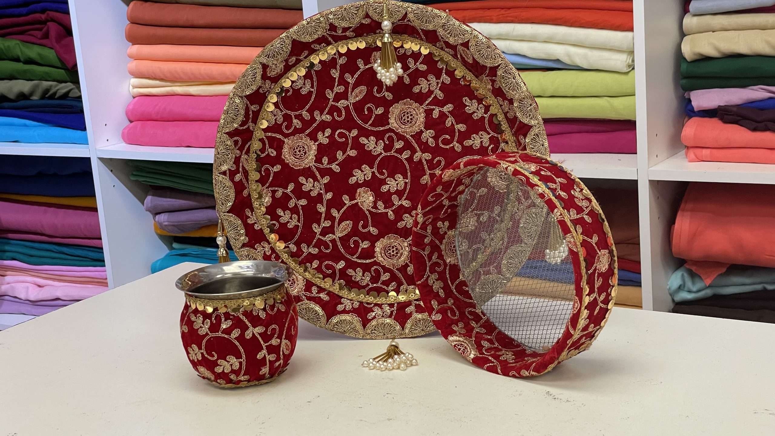Collection of items and decorations that married women use during the Karva Chauth festival. The thali (plate) plays a central role in the festival, as it is used to hold various ritual items and offerings used during the puja (prayer ceremony) and the moon-sighting ritual.