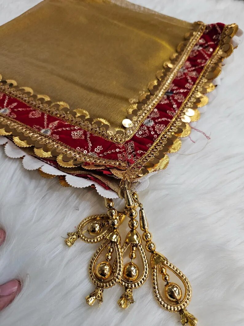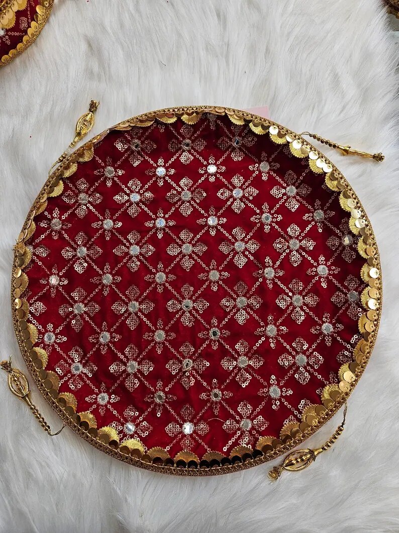 Karwa Chauth Special Puja Thali Set- 8 Items (Red Colour) | Decorated Laced Puja Thali/Kalash/channi/glass/bindi/Mehndi/Cover/Sindoor